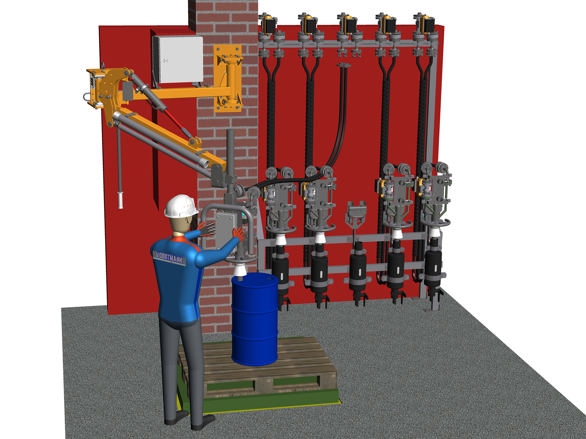 Anlagenseitig wird die Schlauchtrommeleinheit auf einer betreiberseitigen Bühne montiert. Die Einheit besteht aus 3 Schlauchrollern, die gleichzeitig horizontal schwenkbar ist. Inklusive Nottrennsicherungen und Trockenkupplungen.